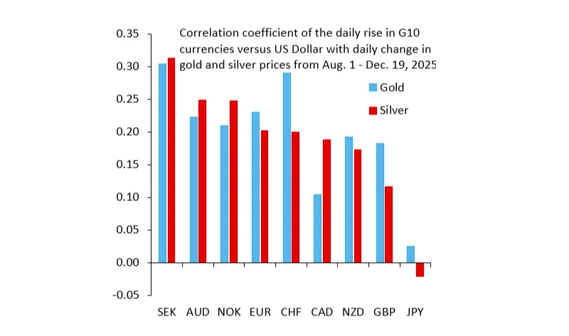 從Brooks給出的圖表顯示G10貨幣兌美元匯率的變化,與黃金(藍色)及白銀(紅色)價格的關聯性。值得注意的是瑞典克朗——這種傳統上波動劇烈且不具避險屬性的貨幣,正因貨幣貶值交易而改變屬性。
