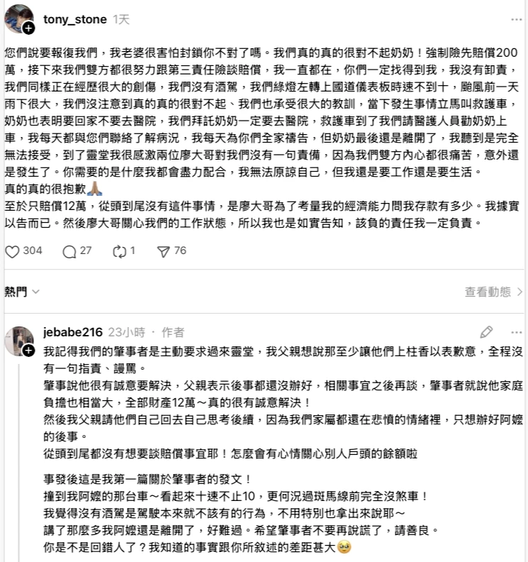 Jebabe216還點名說:「我們家屬難過都來不及了,自己就先開口這錢是什麼意思?覺得金錢至上嗎?那時候我阿嬤還在加護病房跟死神搏鬥中欸!楊先生請你搞清楚!」網友議論紛紛:「這連辦喪事的錢都不夠吧」、「汽車強制險就200萬了」、「直接起訴他們肇事殺人」、「請他們把那連開都開不好的破車拿去賣啊,只有12萬是他們自己的問題」。