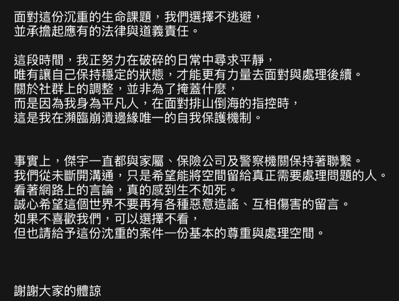 關於社群上的調整,並非為了掩蓋什麼,而是因為我身為平凡人,在面對排山倒海的指控時,這是我在瀕臨崩潰邊緣唯一的自我保護機制。