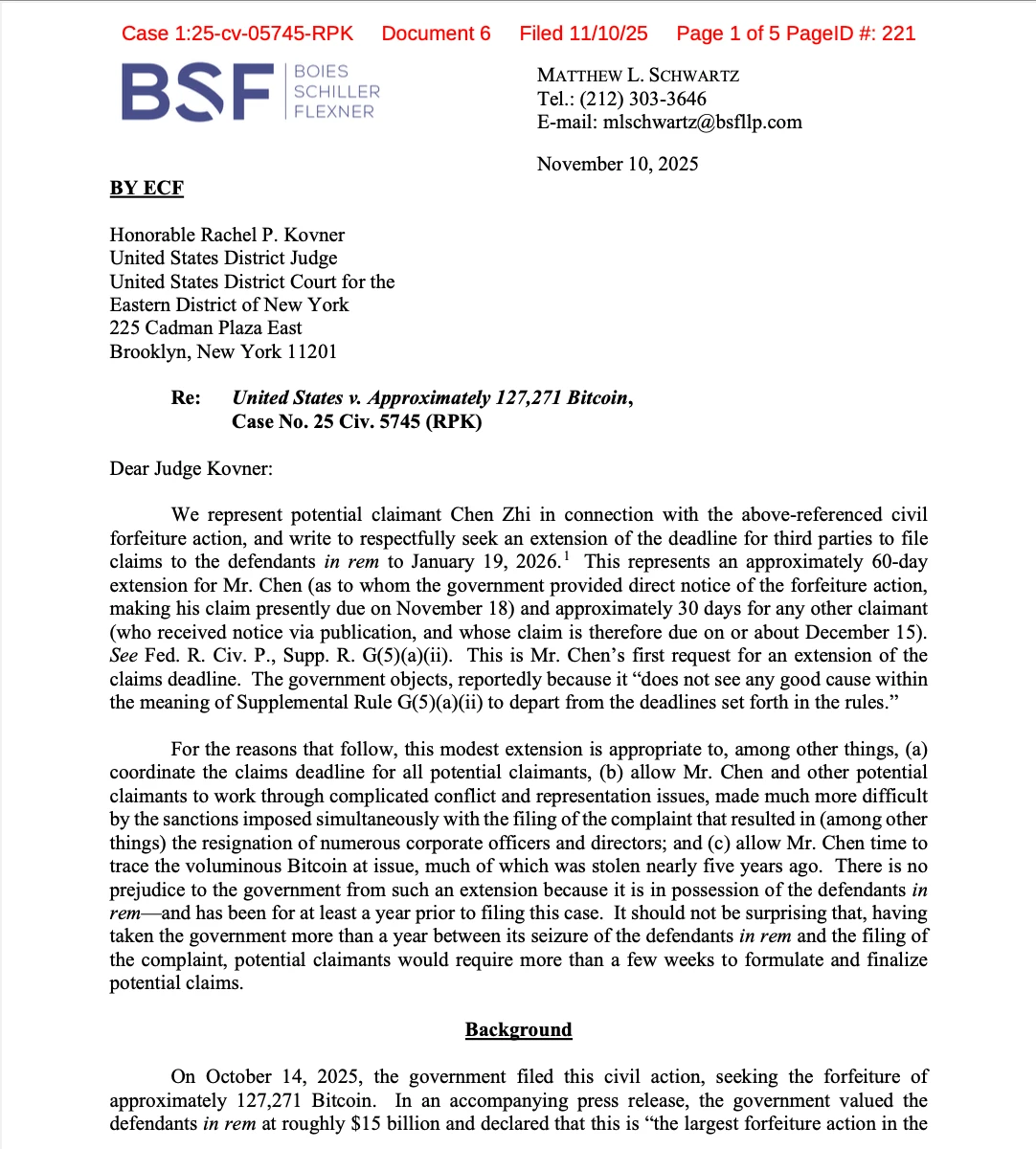 【編譯黃惠瑜/綜合外電】針對美國司法部上月指控柬埔寨太子集團負責人陳志涉及跨國詐騙洗錢,並史無前例尋求沒收價值高達150億美元(約4598億台幣)的12萬7271枚比特幣資產一案,陳志為了趕在個人索賠截止日11月18日到期前救錢,已委託法律團隊10日正式向美國紐約東區聯邦地區法院(United States District Court for the Eastern District of New York)提交動議,請求延長提交索賠的截止期限至2026年1月19日。這是自美英兩國對陳志及其集團實施全面制裁以來,陳志在法律層面上的首次正式反擊。