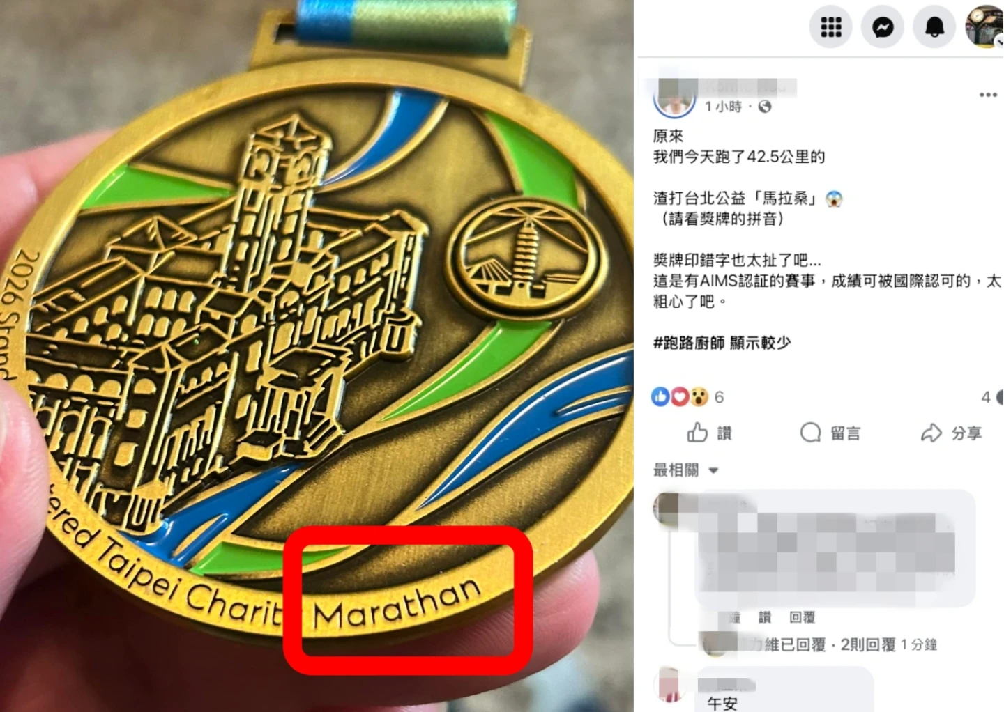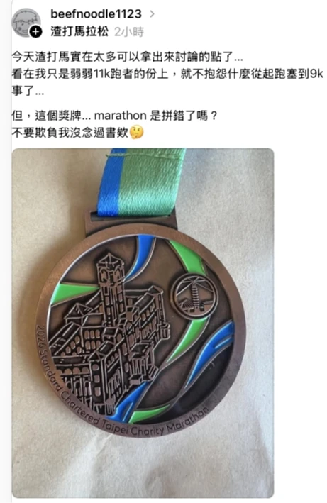 根據跑友分享的獎牌照片顯示,無論是全馬組的金牌還是半馬組的銀牌,獎牌下緣的英文文字將原本應為「Marathon」(馬拉松)的單字,錯誤拼寫成了「Marathan」,倒數第二個字母「o」變成了「a」。Threads跑友beefnoodle1123發文質疑:「Marathon是拼錯了嗎?不要欺負我沒念過書欸」。另一位半馬跑者jackxtrbl也貼出照片表示:「真的是欸好好笑,半馬也是錯的」。