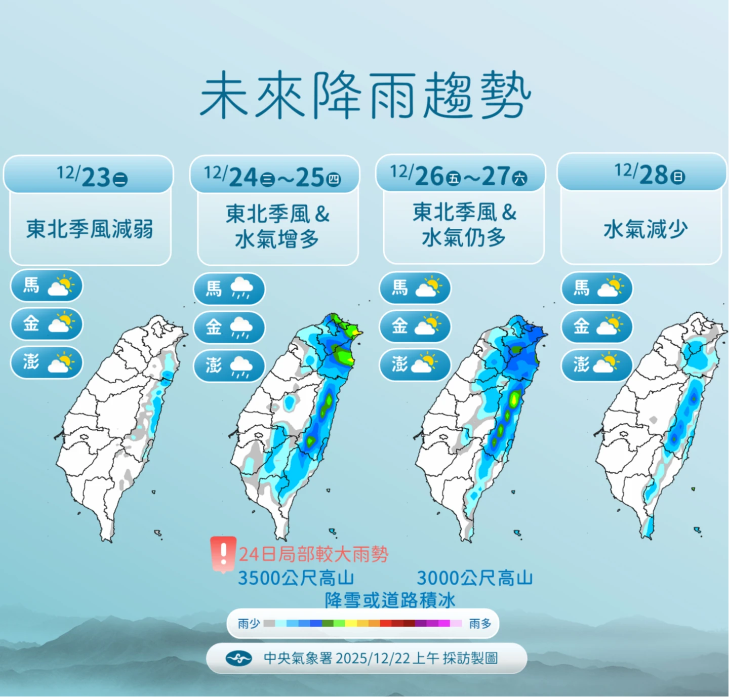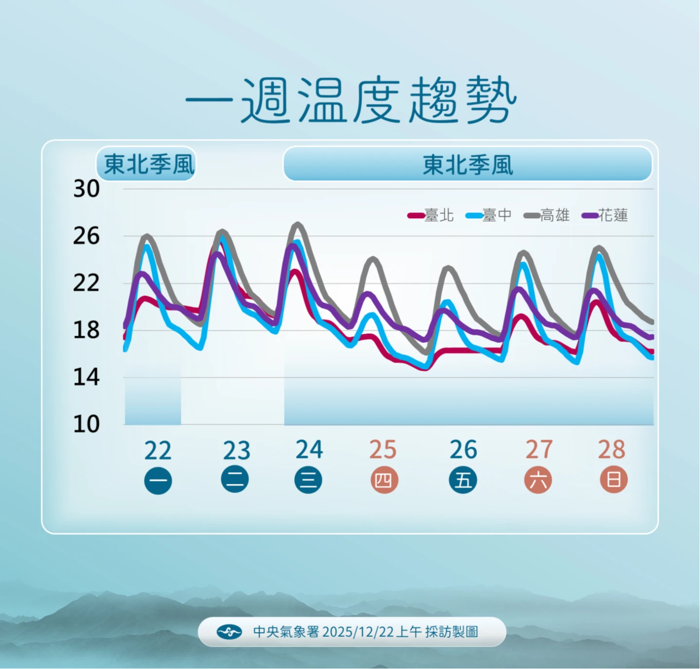 氣象署說,周三起東北季風稍增強,北部氣溫略降;周四(25日)至周五(26日)受冷空氣南下影響,預估強度接近大陸冷氣團等級,全台氣溫顯著下滑。中部以北及宜蘭低溫將下探13至15°C,南部及花東約15至17°C,外島馬祖甚至可能出現10°C低溫。