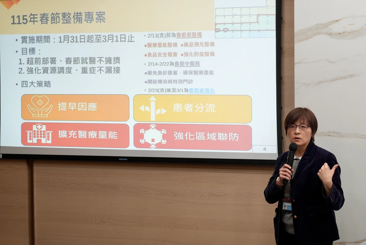 醫事司司長劉越萍表示,去年春節連假長達9天加上流感疫情,急診消化人潮花了一個月才恢復常態,為了確保今年春節期間民眾就醫順暢,衛福部從1月31日至3月1日推動春節整備專案,四大策略包含一、提早因應,設有急診監測7項指標強化調度,並請藥商提高季節性傳染病藥品安全庫存及供應量。