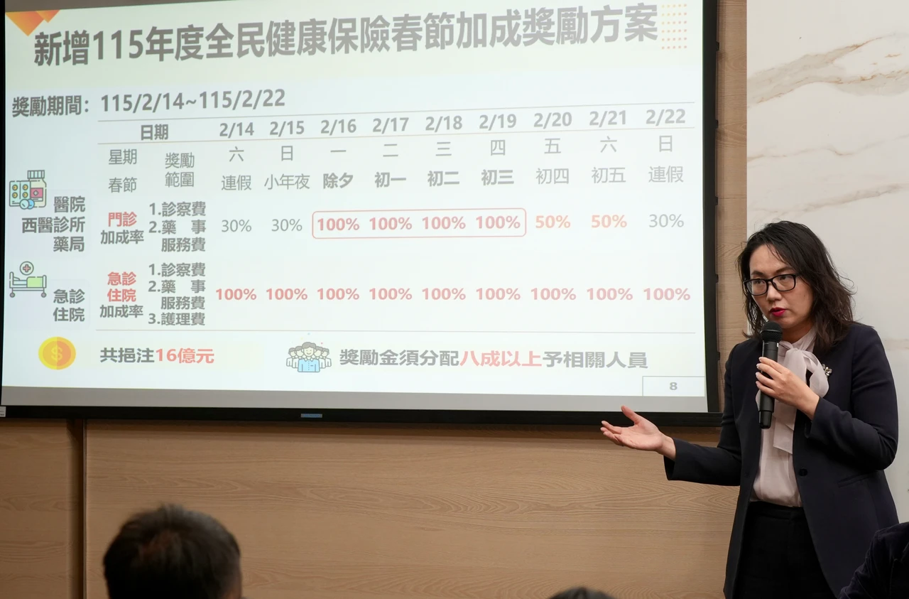 三、健保署投入16億元提供醫療院所診察費、護理費、藥事服務費等加成獎勵,以鼓勵開診擴充春節醫療量能,陳亮妤說,除夕至初三加成100%,初四、初五加成50%,小年夜前及連假最後一天加成30%,獎勵金的80%必須分配給第一線醫事人員(醫師、護理、藥師、醫檢等)。