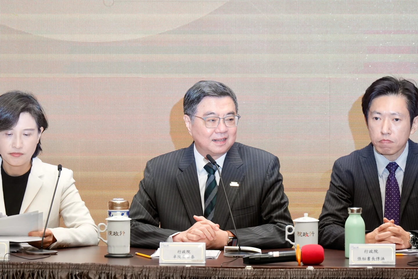 鄭麗君、楊珍妮所率談判團隊昨早返抵國門,行政院今早召開記者會,卓榮泰、鄭麗君、楊珍妮、政院秘書長張惇涵、經濟部長龔明鑫、國發會副主委彭立沛及政院發言人李慧芝等人出席。