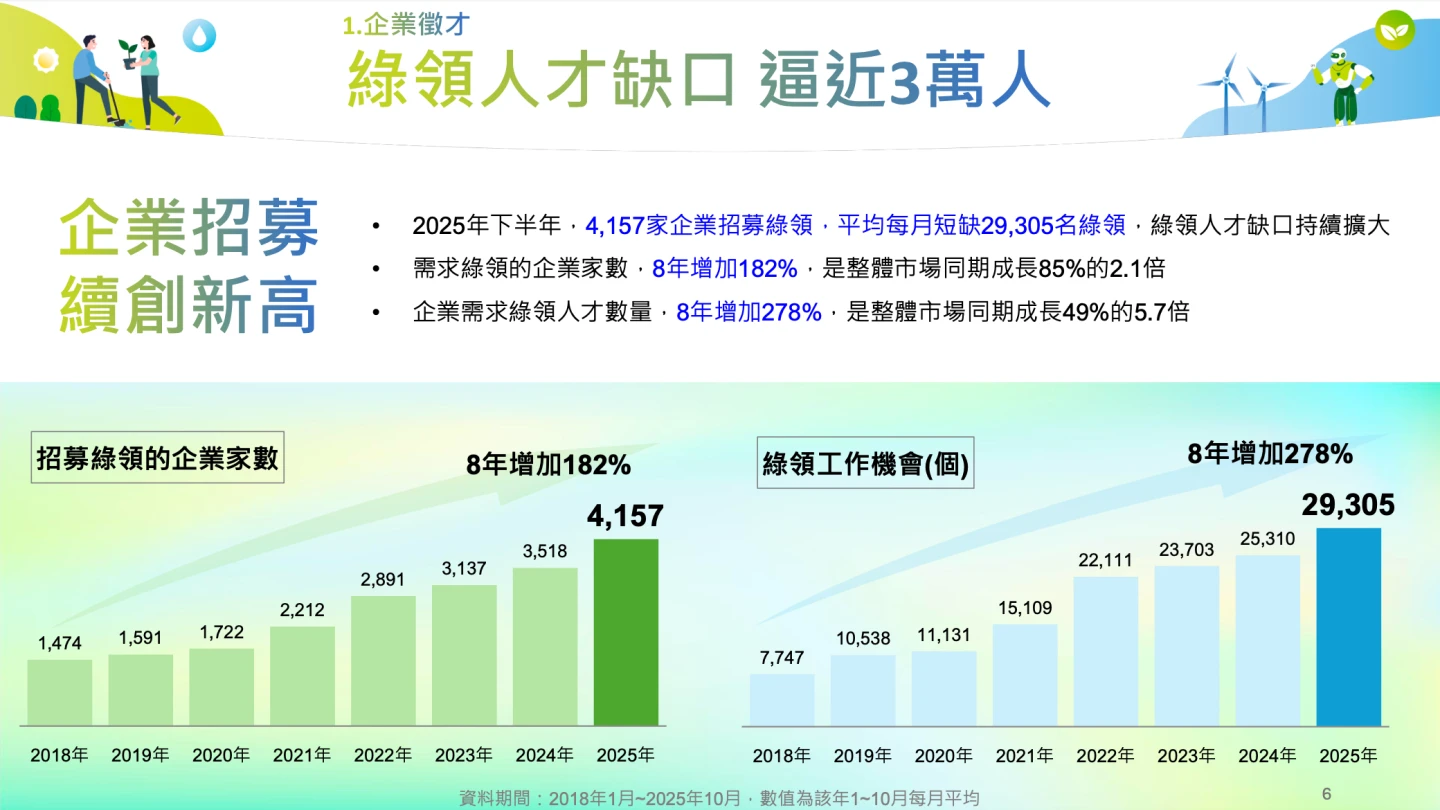 【記者王良博/台北報導】環境部與104人力銀行今(23)日發布「2025下半年綠領人才就業趨勢報告」,根據104人力銀行資料庫8年期統計,台灣綠領徵才企業家數由2018年的1400多家,成長至今年4157家,8年成長182%,綠領人才缺口逼近3萬個,較8年前成長278%,另外,綠領職缺的月薪中位數,比整體職缺更高,高階綠領人才年薪上看200萬元。