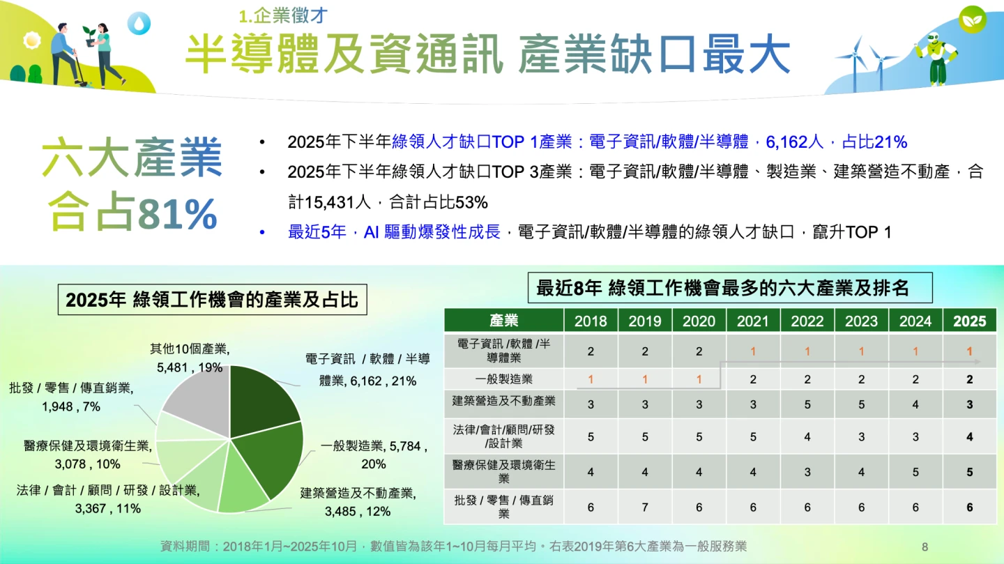 104人力銀行提到,電子資訊與半導體業自2021年起,連續5年居人才需求最大宗,綠色製程、節能、環安衛、永續報告與AI優化能力,已成科技業核心能力,2025年綠領AI相關工作有5340個,占所有綠領工作數的18.2%,遠高於整體市場AI工作占比約10%,也比去年增加35%,更比8年前暴增388%。