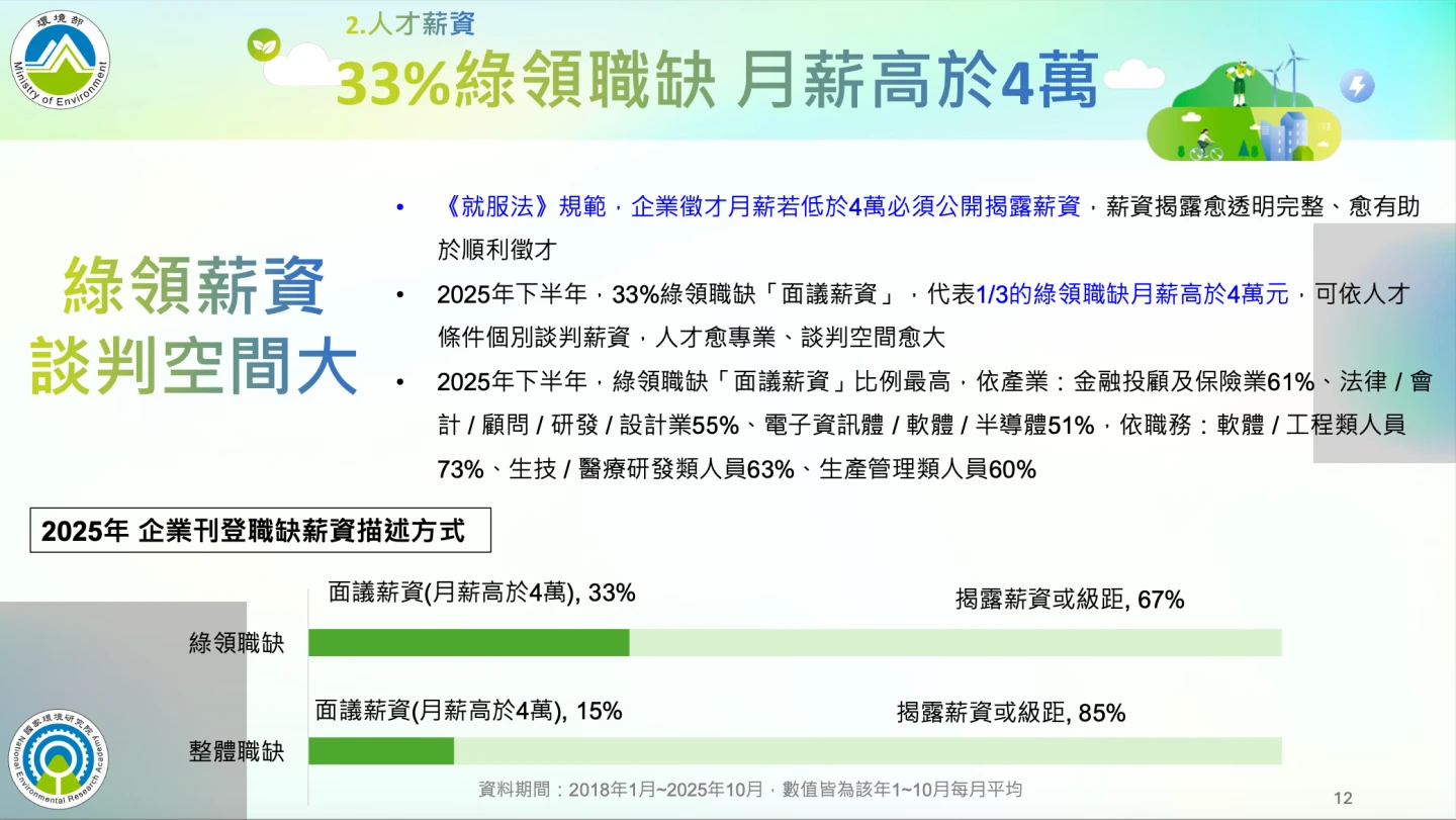 至於綠領工作的薪資,104人力銀行指出,綠領職缺的月薪中位數(PR50)為4萬元,比整體職缺的3.8萬高出5.3%,居前四分之一的高薪職缺(PR75)月薪4.6萬元,也比整體職缺的4.4萬元高出4.5%,另外,月薪高於4萬元的薪資「面議」綠領職缺,占比達33%,也遠高於整體徵才市場的15%,反映企業對於具備專業證照、永續管理能力、AI技能者,願意提供更佳待遇。