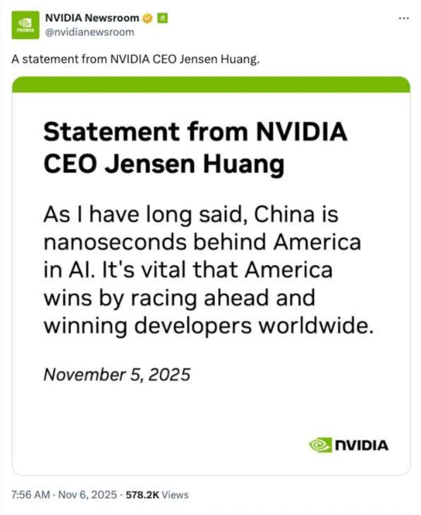 然而,就在《金融時報》發布報導數小時後,輝達在社群網站X平台官方帳號發布黃仁勳的另一份聲明,文中寫道:「正如我一直以來所說,中國在AI領域落後美國僅幾奈秒。極為重要的是,美國必須跑在前頭,贏得全球開發者的支持,才能最終取勝。」