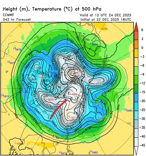 前中央氣象局長鄭明典貼出「貝加爾湖脊場」照片指出,「這是明天下午8點的預測圖。」他分析500百帕高度場,在貝加爾湖附近出現深深的脊場,脊場東側的偏北風會把冷空氣往南送,「這個位置的脊場,冷空氣傳送放像正好是往台灣方向來,這是冬季台灣容易出現低溫的天氣型態!」