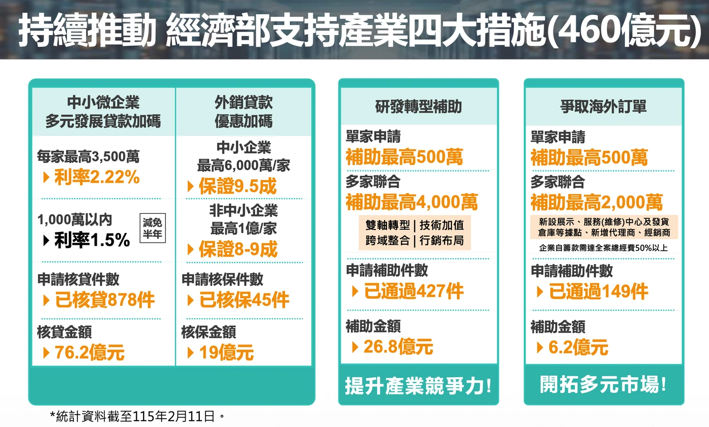 龔明鑫表示,「4大措施、金輔導」的460億還是會持續的進行。目前為止,所有申請的案件大概已經超過了3000件,已經核准、已經通過的案件大概有1000多件。所以我們希望能夠持續來加強對企業界的支持。
