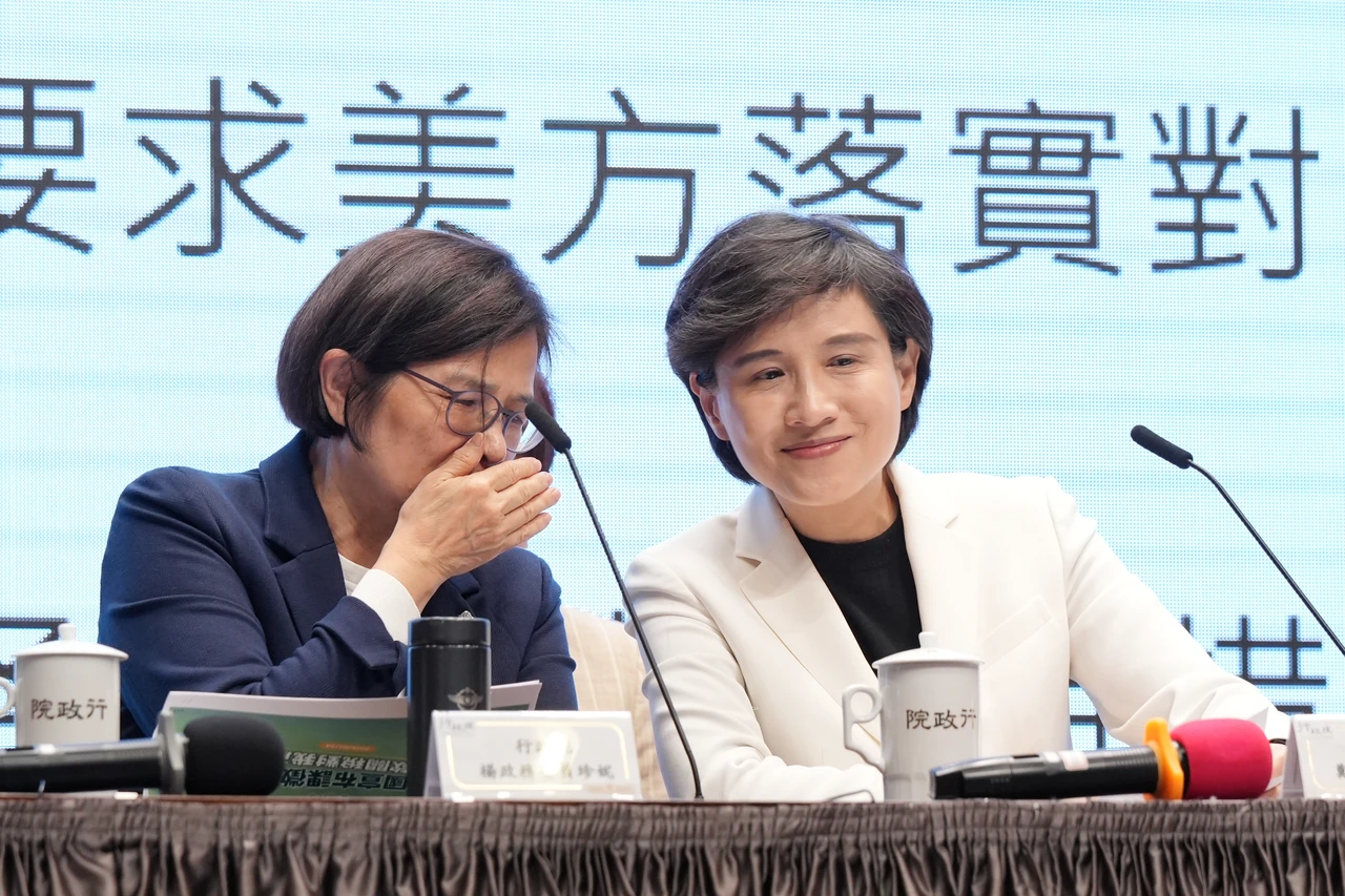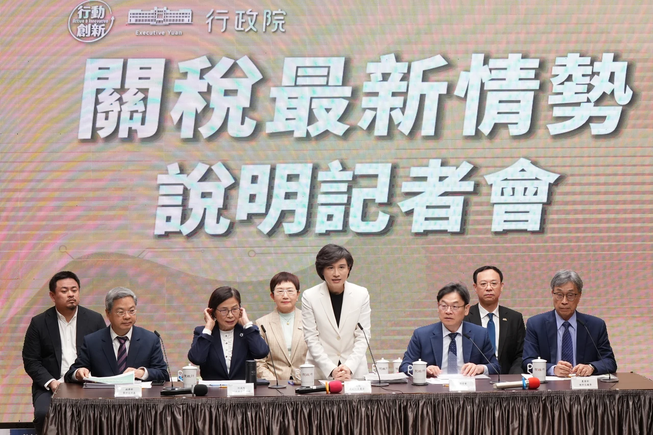 【財經中心/台北報導】行政院今(24)早9點舉行「關稅最新情勢說明記者會」,鄭麗君副院長、楊珍妮政委、葉俊顯政委兼國發會主委、財政部莊翠雲部長、經濟部龔明鑫部長、勞動部洪申翰部長、農業部陳駿季部長、衛福部石崇良部長出席。