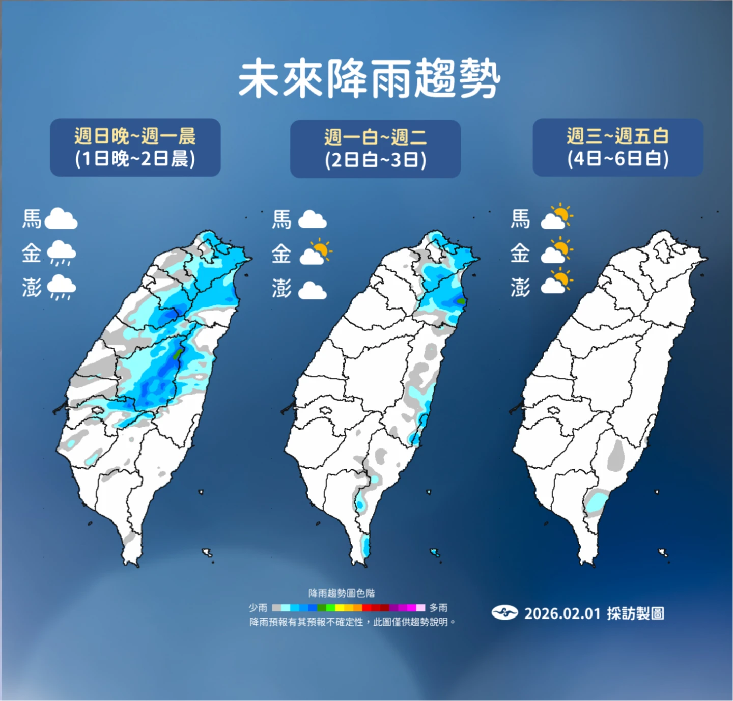 這波濕冷天氣預計持續至周二,隨後天氣將出現轉折。最新模式模擬顯示,2月4日至6日(周三至五)大陸冷氣團將逐日減弱,各地天氣轉為晴朗穩定,白天氣溫回升舒適。然而,吳德榮提醒,雖然冷氣團減弱,但受夜間「輻射冷卻」效應影響,早晚氣溫仍低,部分縣市平地最低氣溫甚至可能降至10度以下,日夜溫差極大,民眾早出晚歸仍需注意保暖。