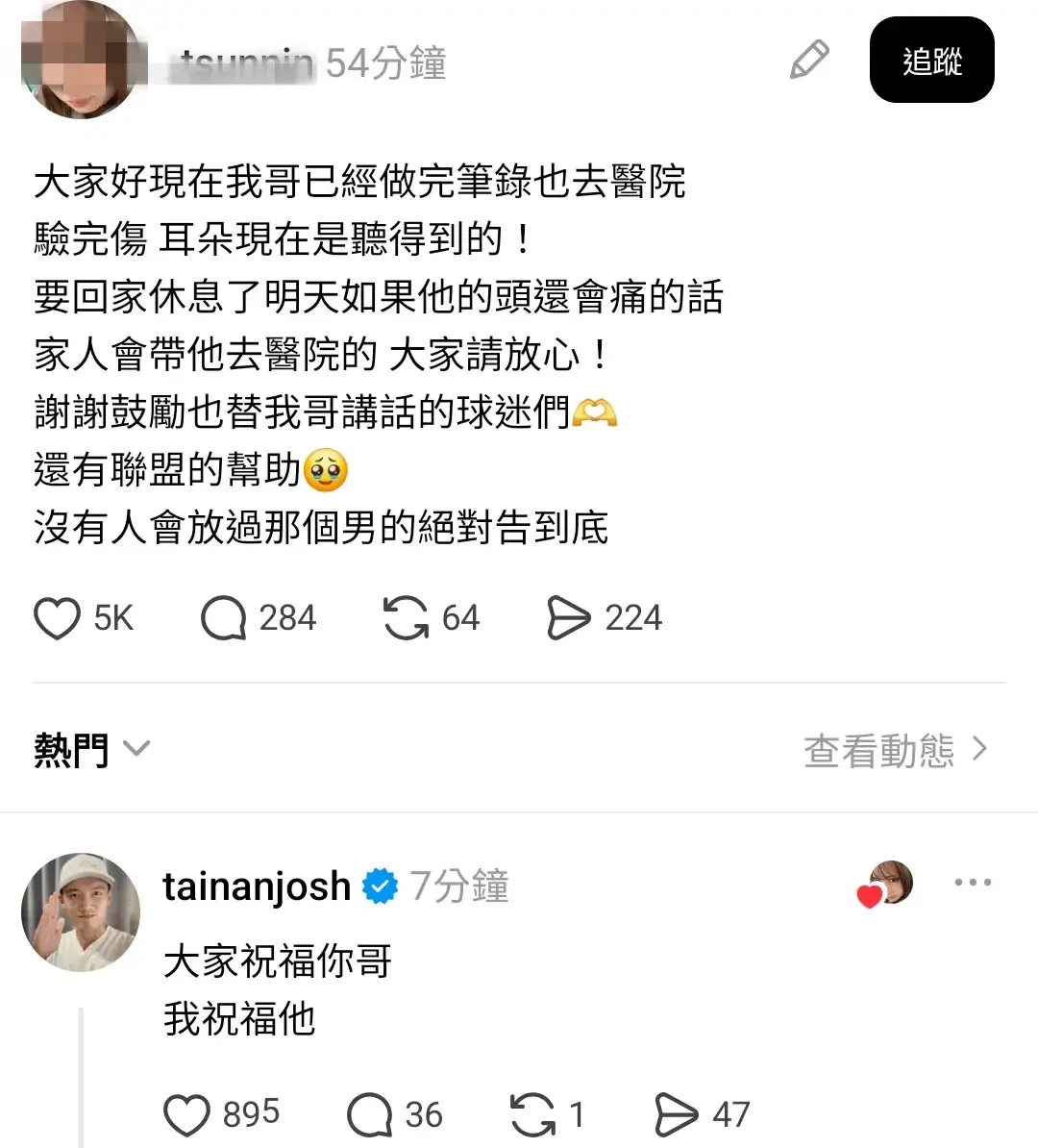 被搧巴掌工讀生家屬透露,絕對會對蔣男告到底,棒球網紅「台南Josh」留言打氣。取自當事人社群Threads zoomin