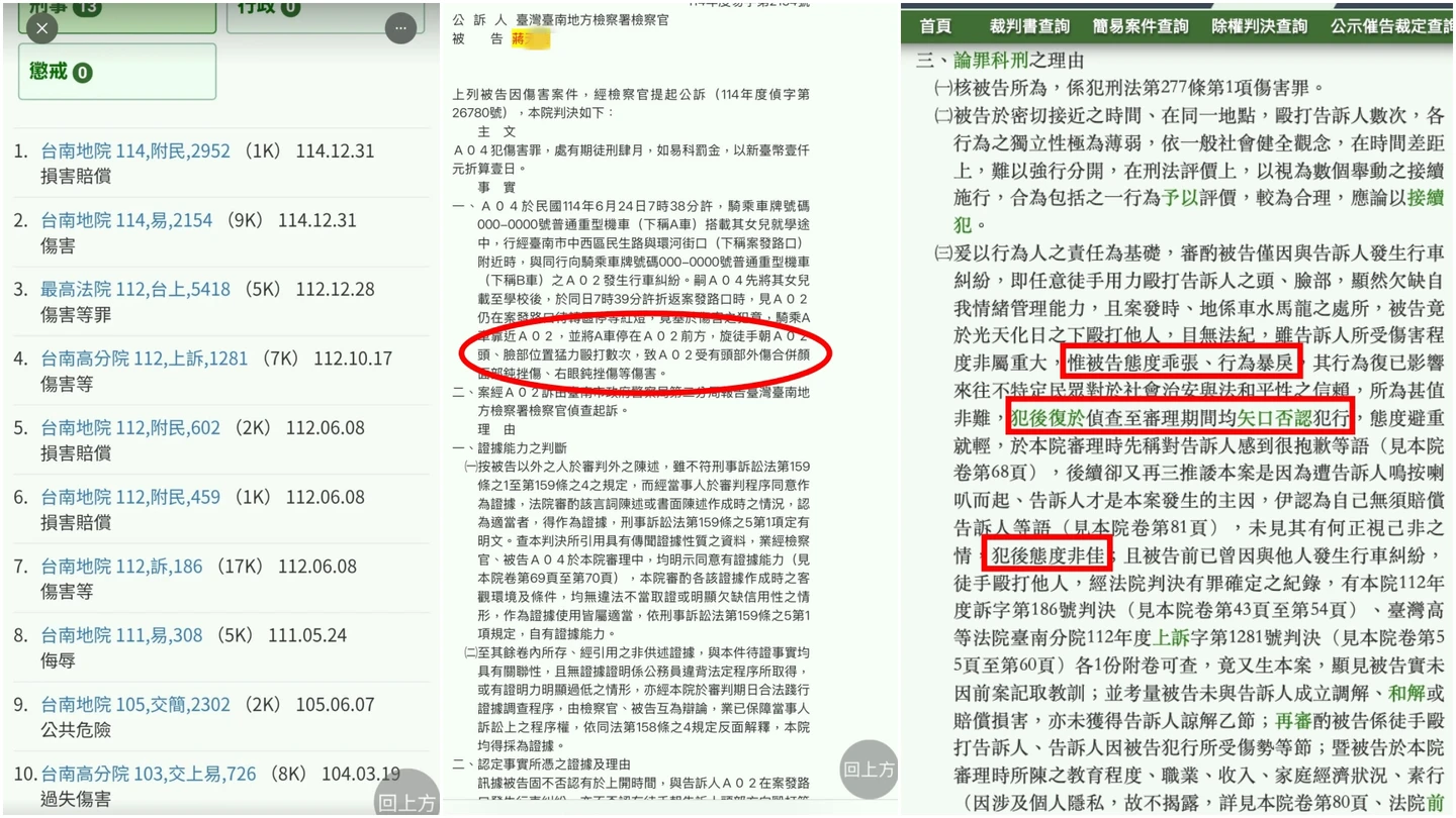 蔣男被翻出前科累累(左),專門攻擊他人頭臉(紅圈處),甚至法官在判決書內痛斥蔣男態度乖張、行為暴戾(紅框處)。取自司法院裁判書系統 zoomin