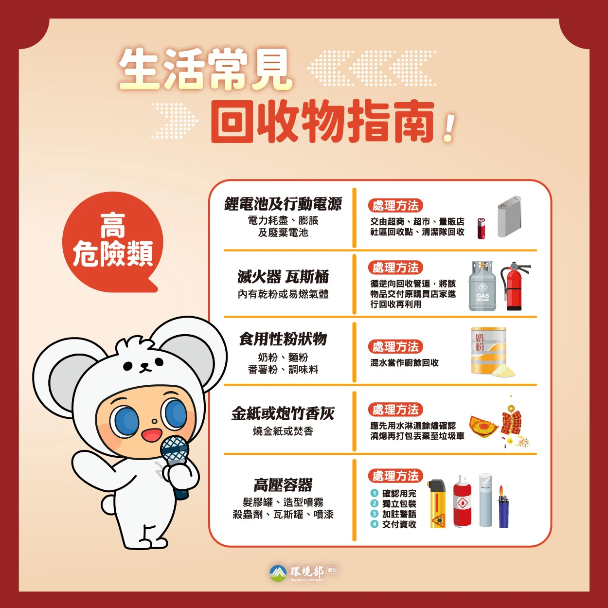 第二,「危險隔離」,請務必留意鋰電池、行動電源、打火機、高壓瓶罐:瓦斯罐、殺蟲劑、髮膠噴霧等請單獨打包,並告知清潔隊員,切勿丟入垃圾車,避免擠壓造成爆炸。