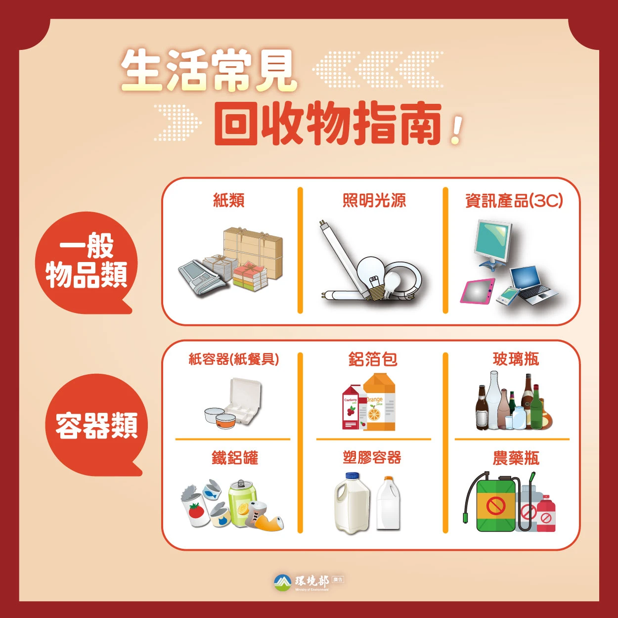 環境部說明「回收三重奏」,第一,「放對位置」,容器回收前,請清空殘餘液體與殘渣;紙類、塑膠、金屬等可回收物請確實分類,不混入一般垃圾。