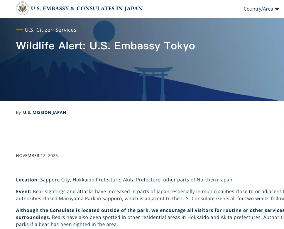 在這份11月12日發布的警報中,美國駐日本大使館還指出,札幌市一個毗鄰美國領事館的公園,在發現熊出沒後已關閉兩周。