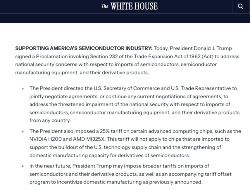 公告稱,這25%抽成關稅適用範圍「非常有限」,為了支持美國技術供應鏈建設和增強國內半導體衍生品製造能力而進口的晶片則不在課徵關稅之列。