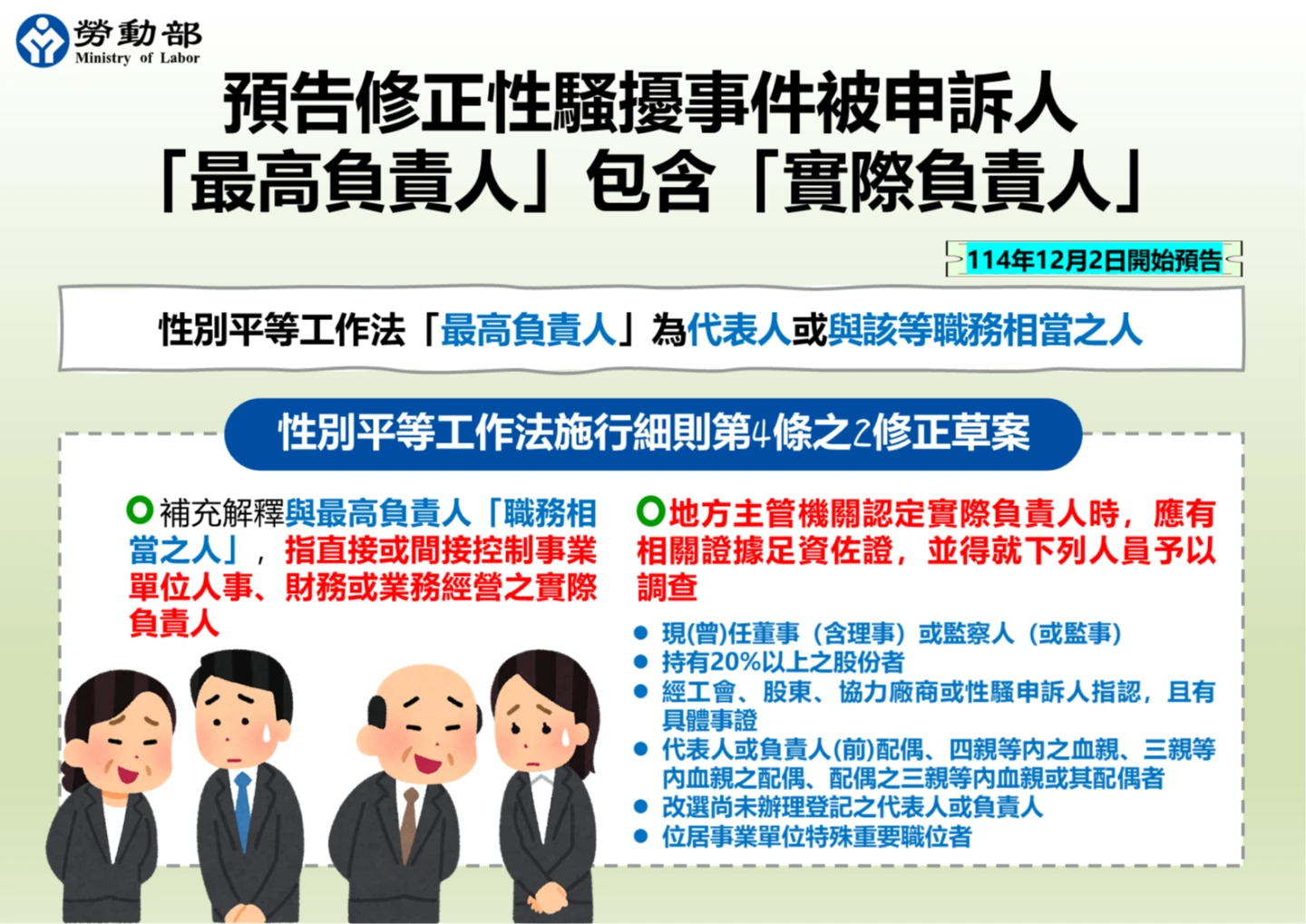 【記者王良博/台北報導】《性別平等工作法》規定,職場性騷擾的被申訴人如果是企業最高負責人,可以直接向地方主管機關提起申訴,不走企業內部處理程序。勞動部今(2)日預告修法《性別平等工作法施行細則》,將「最高負責人」的定義納入「實際負責人」,包含公司董監事、持股20%以上、負責人的配偶等6款樣態。
