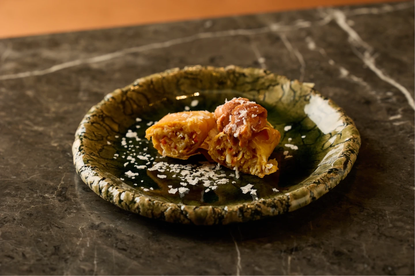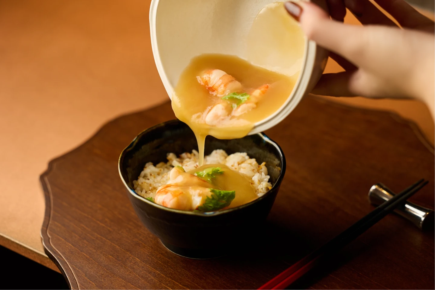 另外,若是加價至2,880元套餐還可將「蝦皇撈汁.蒜味炒飯」升級「鴨肝飯」,將肥腴油潤的鴨肝搭配鐵板蒜味炒飯,入口盡是絲滑享受。而3,600元套餐,除了同樣提供「鴨肝飯」,開胃料理則升級為「蟹.海膽.春捲」,並再增加「魚翅天婦羅.撈汁」,共10道料理。