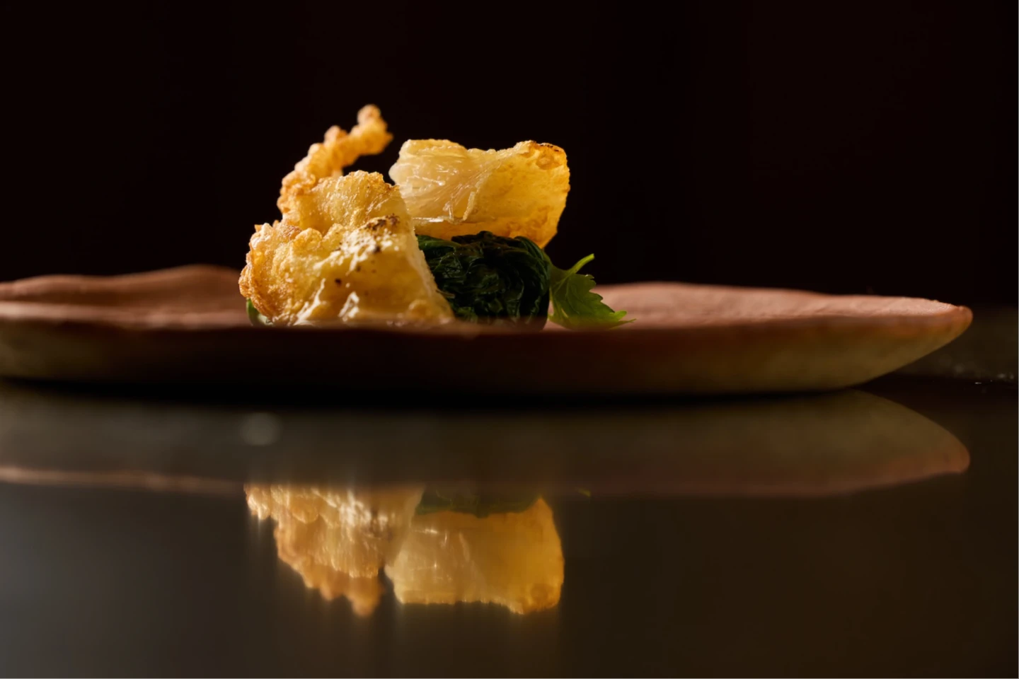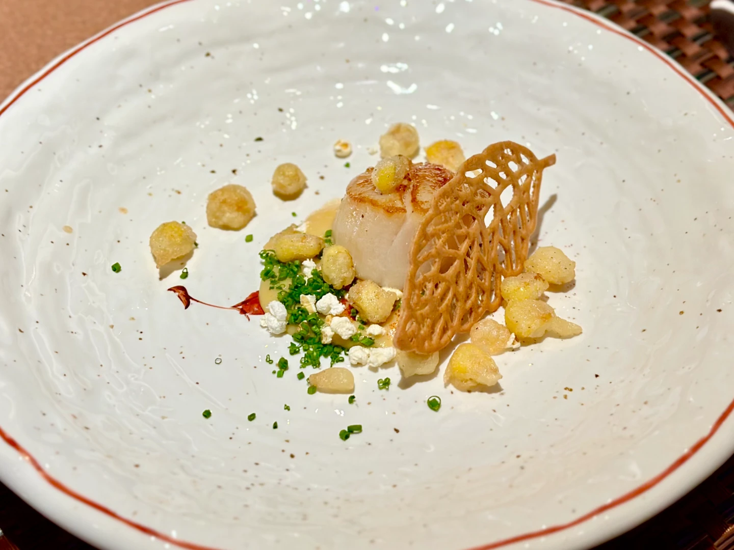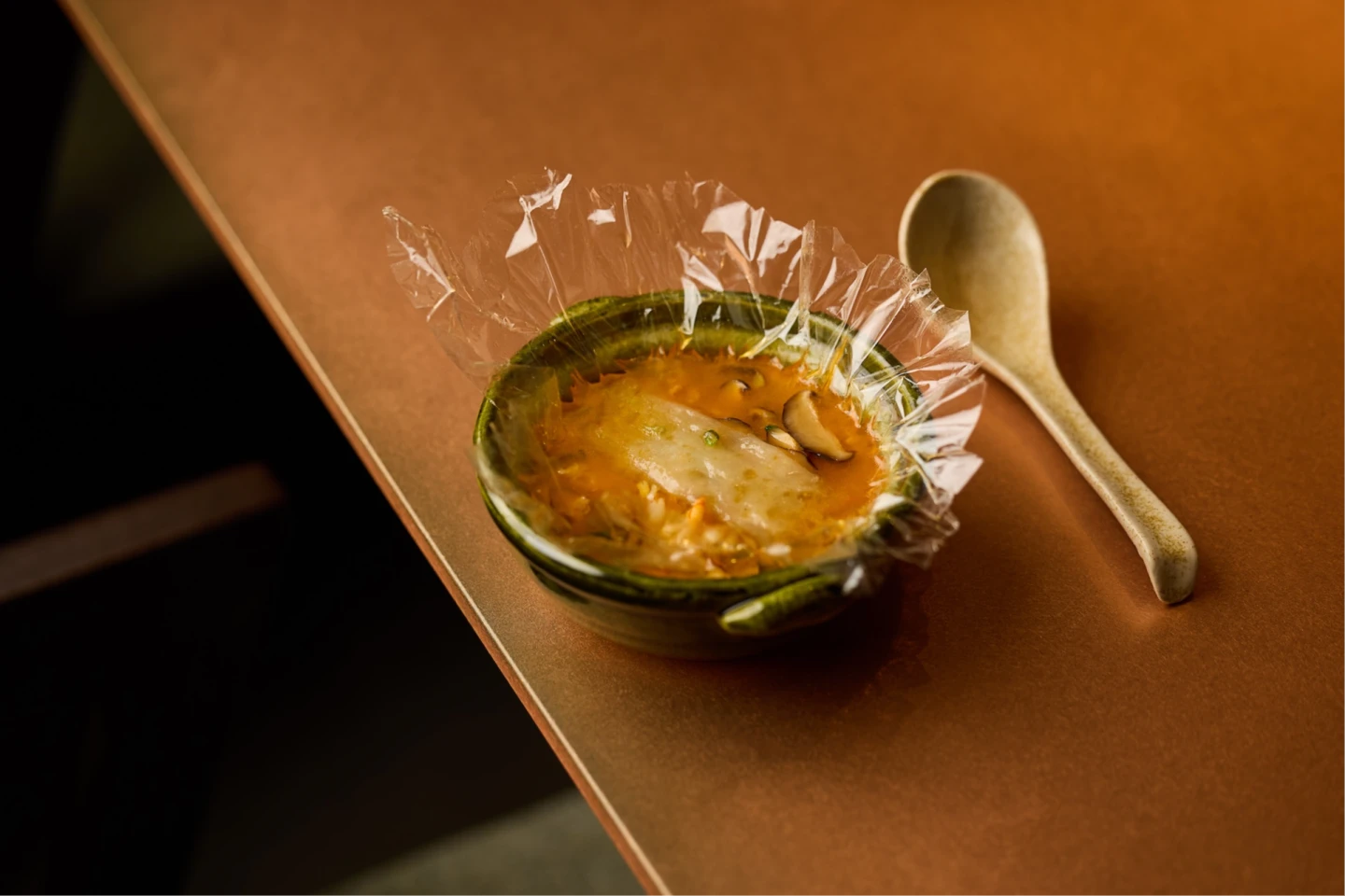 還有向彰化、基隆經典小吃致敬的「鼎邊銼玻璃燒」,先以澳洲水姑娘龍蝦頭肉、香菇、蝦米、芹菜等食材,再加入雞豚骨高湯作為底蘊以及乾燥金針花增加明亮酸感,封入透明玻璃紙中再加熱,最後添上以在來米粉漿鐵板煎製的鼎邊銼。