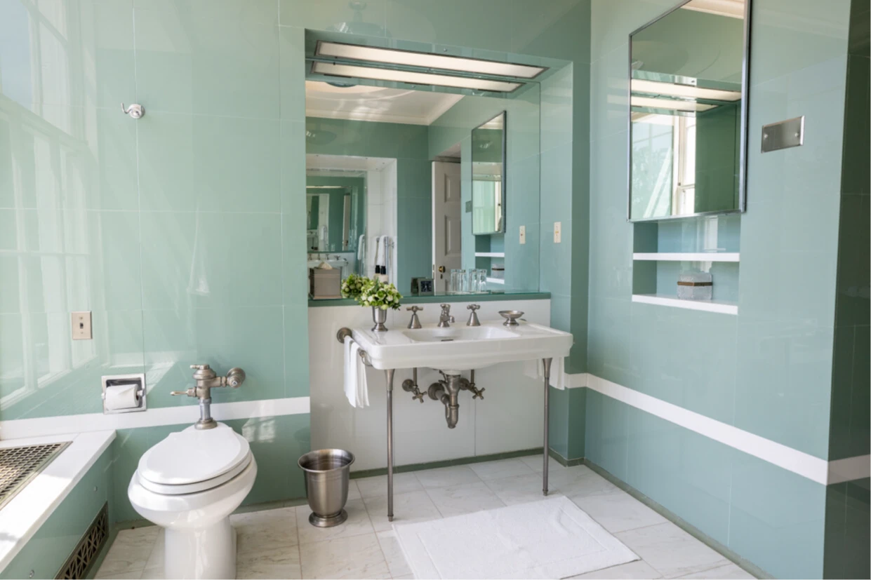 這個浴室是供賓客使用,並非川普的私人盥洗室。「雕像大理石」是一種高檔的、純白色義大利大理石,帶有戲劇性的灰色紋路。傳統上用於雕塑和雕像,如米開朗基羅的《大衛》像,現在則越來越多用於檯面和地板。