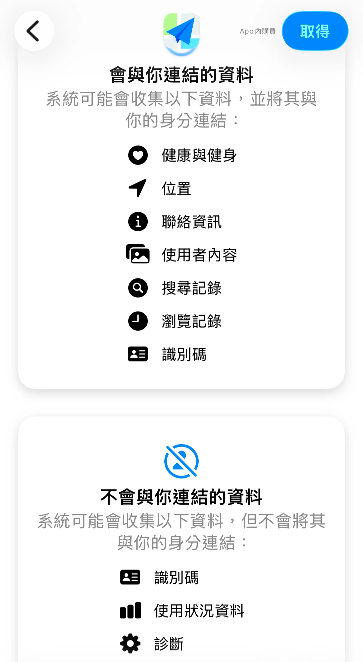 官方中聲明,下載APP後,系統將蒐集用戶的位置、聯絡資訊、使用者內容、搜尋紀錄和瀏覽紀錄,並將其內容與身分連結。