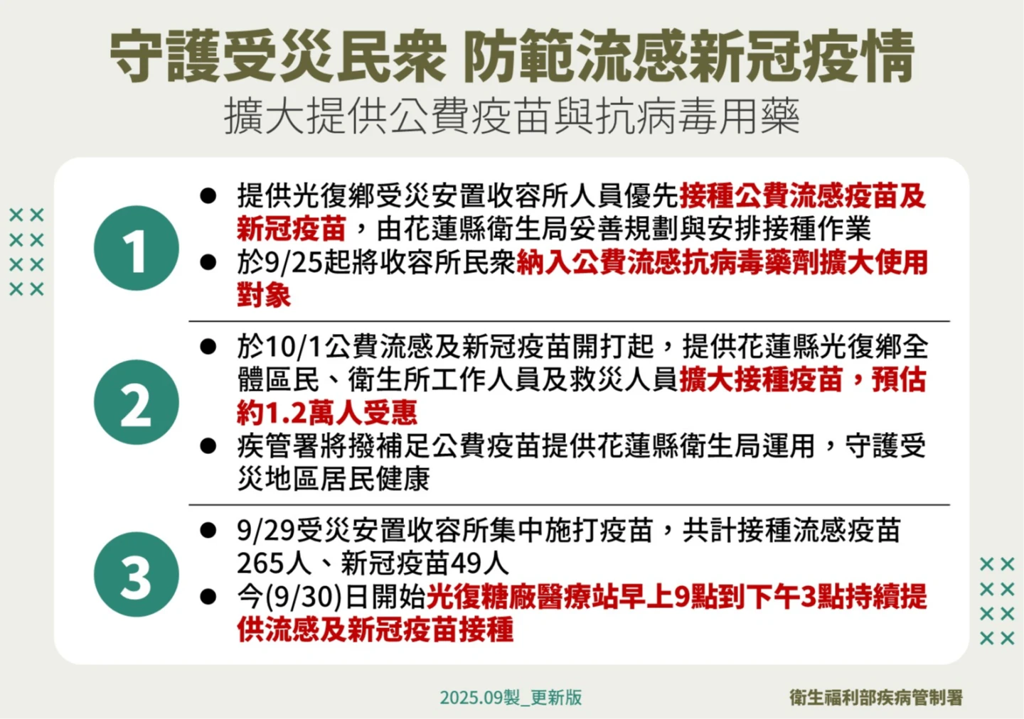 民進黨立委李坤城、黨團幹事長鍾佳濱今日召開「偏鄉災後無人機送藥常態化 民眾用藥不中斷 」記者會,衛福部次長莊人祥應邀出席,被問及志工是否可能將病菌帶出花蓮,他說明,當地流感疫情和非災區都差不多,沒有所謂帶出來,疾管署也於9月底優先把收容所民眾納入公費流感抗病毒藥擴大使用對象,也提早開打公費流感和新冠疫苗。