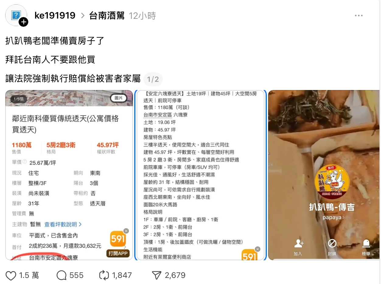還有網友搜到,鄭男正開價1180萬元出售位於南科附近的透天厝,發文呼籲「拜託台南人千萬不要買」,以利法院後續強制執行賠償給被害家屬。