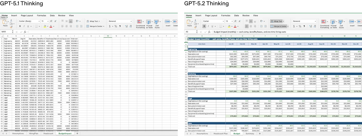 GPT-5.2 Thinking專為更深入的工作而設計,協助使用者處理更複雜的任務,包括製作簡報、試算表及其他檔案,成果更完整細緻。模型在編寫程式碼、摘要長篇文件、回答上傳檔案相關問題、逐步解決數學和邏輯問題,以及協助規劃與決策方面均有明顯進步,回應結構更清晰,提供的細節也更實用。
