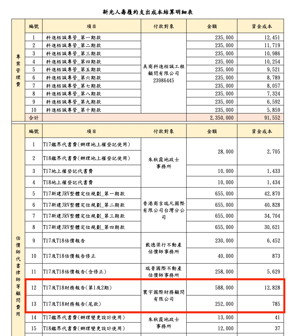 經查台北市議會大會議決案目錄中,報告事項第140470號,「新光人壽履約支出成本結算彙總表及明細表」第6頁出現「寰宇國際財務顧問有限公司」,證實寰宇公司是曾受新壽委託的外部專業顧問,而8位北車商場甄審會出席委員名單,范雪梅現任寰宇國際財務顧問有限公司總經理。