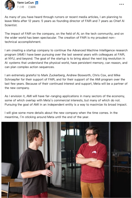 楊立昆11月19日在職場社群平台領英(LinkedIn)發文,證實將在年底離開Meta,「正如許多人從傳聞或近期媒體報導了解到的,我正計劃離開待了12年的Meta」。