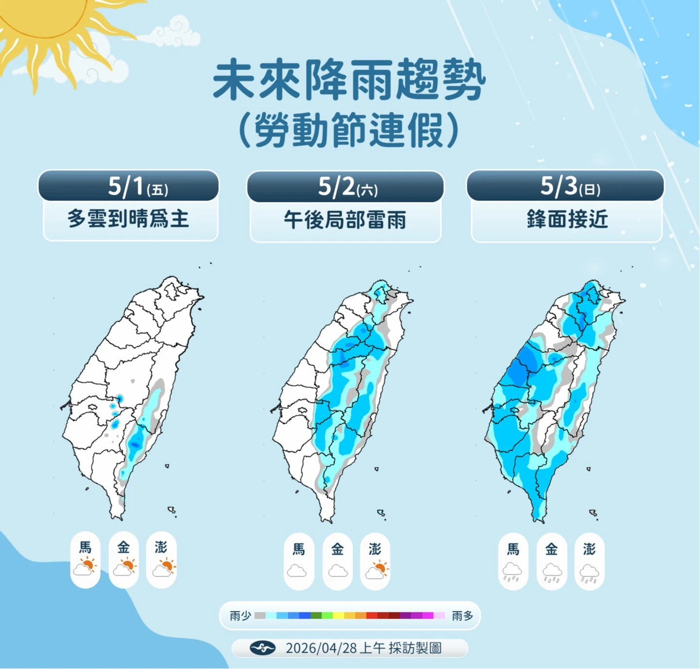 5月3日(下周日)收假日鋒面接近,各地雖仍以多雲到晴為主,但午後大台北、宜花及山區有局部短暫雷陣雨,是連假雨勢最集中的一天,中南部也偶有局部陣雨或雷雨。