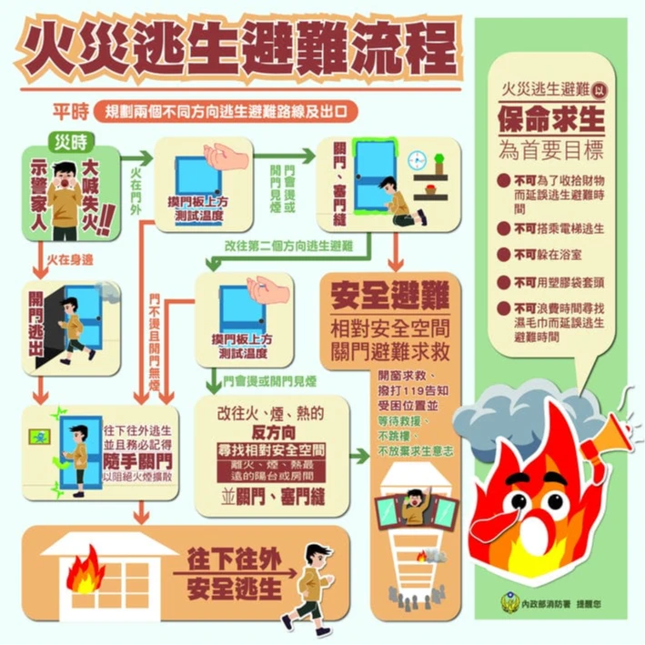 內政部消防署提醒,火場逃生避難流程,當火警發生時民眾首先「開門,往一樓向外逃生」消防署說明,由於煙平均上升速度為每秒3~5公尺,人平均往上速度為每秒0.5公尺,人往上跑是跑不贏煙的,因此火場逃生原則為往下逃生。