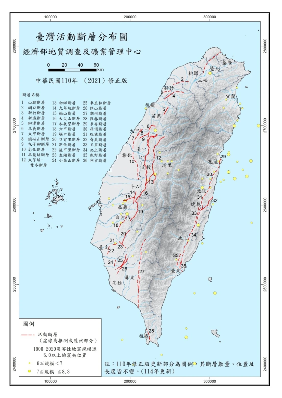 地礦中心表示,就監察院指正除檢討精進外,也在114年10月起,台灣活動斷層分布圖已不再分類,所有斷層統一顏色及圖例。