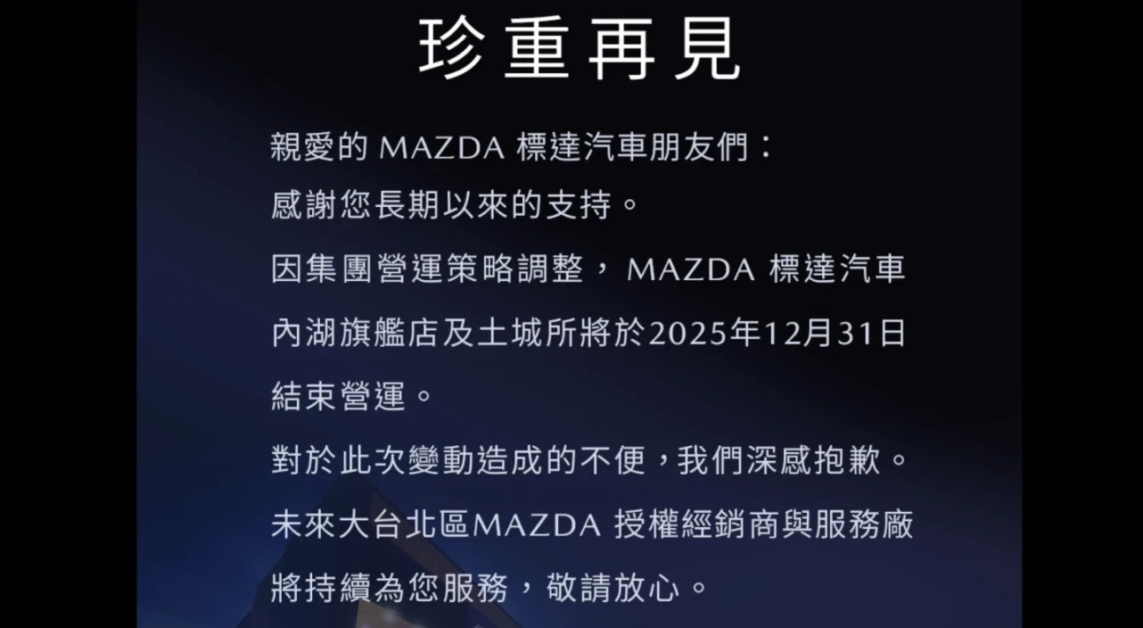 【記者吳珍儀/台北報導】台灣馬自達經銷商太古標達汽車對外宣布,旗下位於內湖與土城的兩家據點將於今年12月31日正式結束營運。台灣馬自達隨後也證實,雙方的合作關係將在年底畫下句點。消息一出,立即在車主社群及社群平台上引發熱烈討論,有人覺得惋惜,也有人哀嚎,以後不知道要去哪裡保養了。