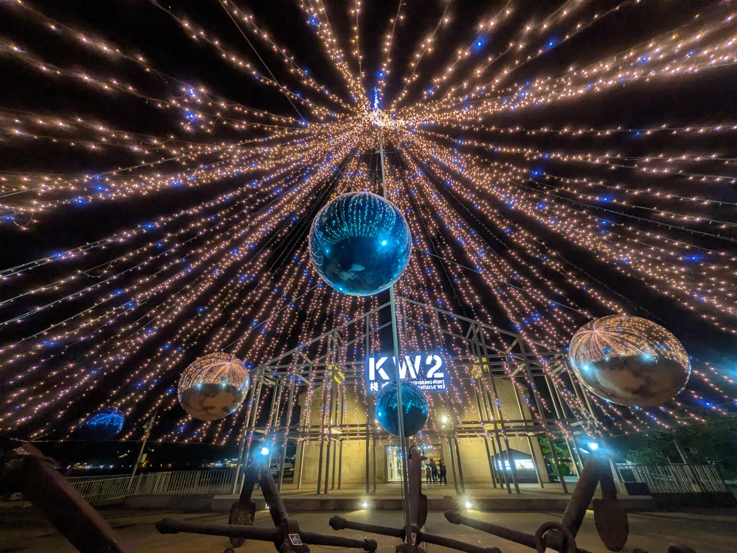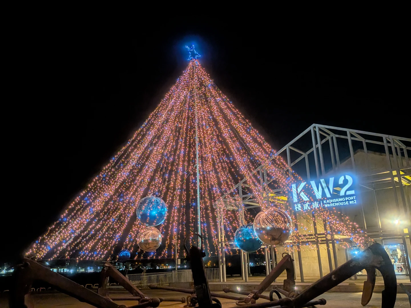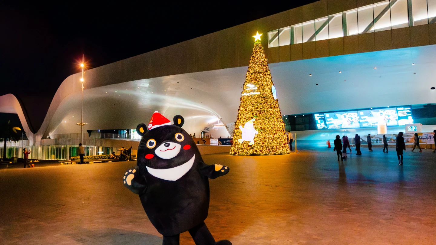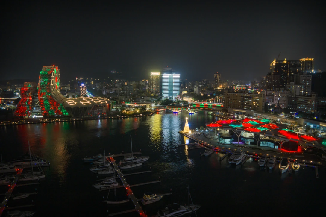 除市中心外,港灣景點同樣吸睛。棧貳庫KW2廣場以巨大船錨打造「漂浮耶誕樹」,結合航運地標與燈光藝術,象徵高雄港的歷史記憶與祝福;高雄流行音樂中心推出「金勾TREE」,在珊瑚礁群戶外堤岸展演燈光秀,與港景相互輝映,成為港濱最潮打卡點。