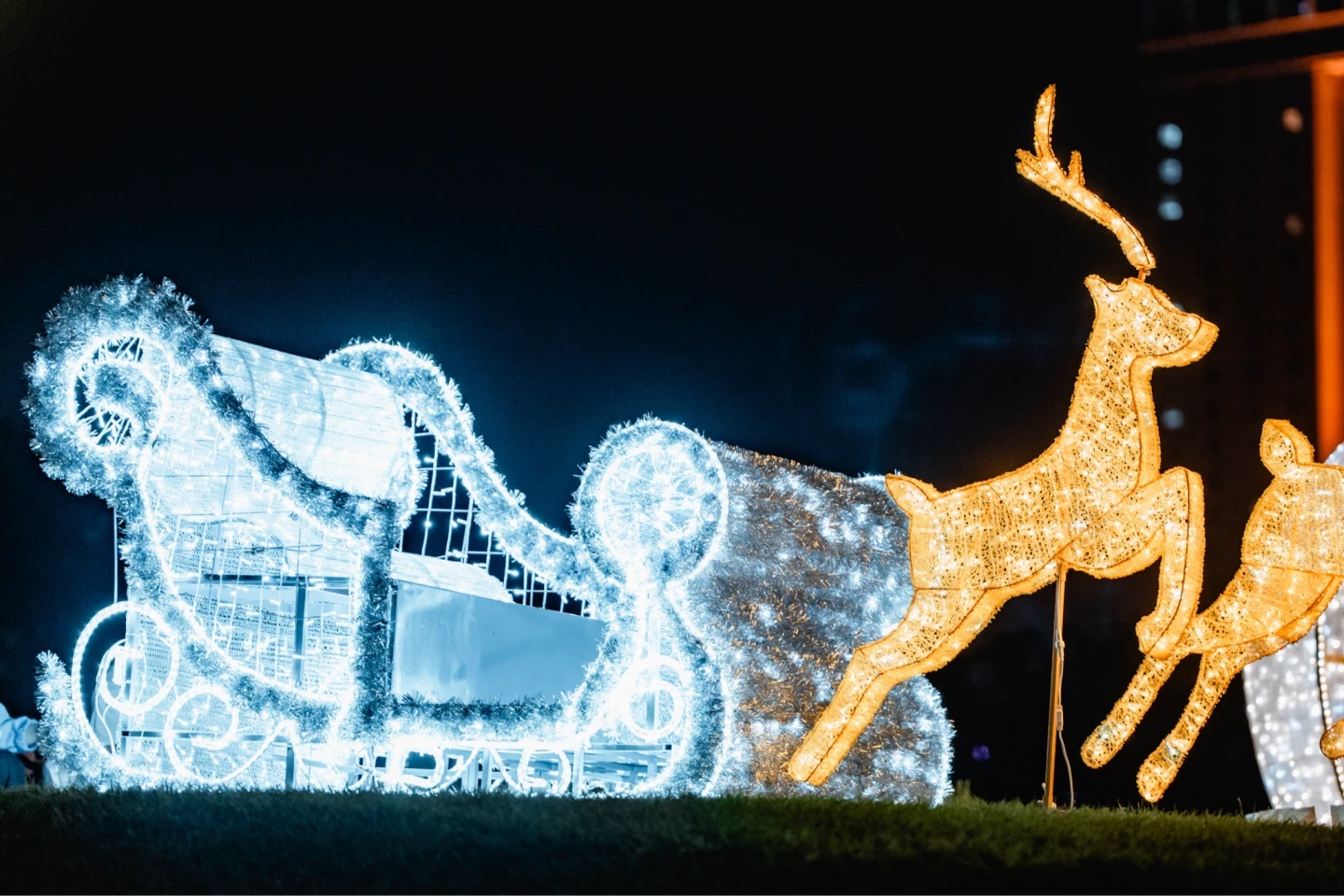 高市府今年以「聚光成城.聖誕禮讚」為主題,在中央公園捷運1號出口前矗立的「永恆星冠」成為最受矚目的拍照熱點,樹下童話風聖誕小屋,加上極光隧道、銀河光廊、糖果森林等12組燈飾作品,延伸至中山路兩側的聖誕串燈,營造出宛如光海般的夢幻場景。