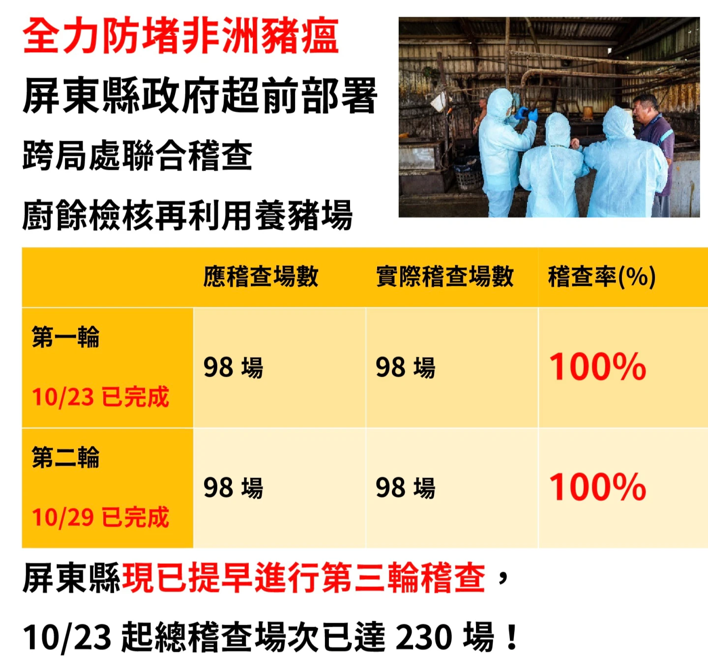 屏東縣政府嚴正聲明,針對羅智強委員今日的惡意污衊,10月22日農業部證實台中爆發非洲豬瘟案例,屏東縣政府翌(23)日立即啟動包括環保局、農業處、動防所、警察局等跨局處聯合稽查,兵分五路前往縣內98場廚餘檢核再利用養豬場,23日當天就完成第一輪稽查,稽查率100%,全力防堵非洲豬瘟疫情。