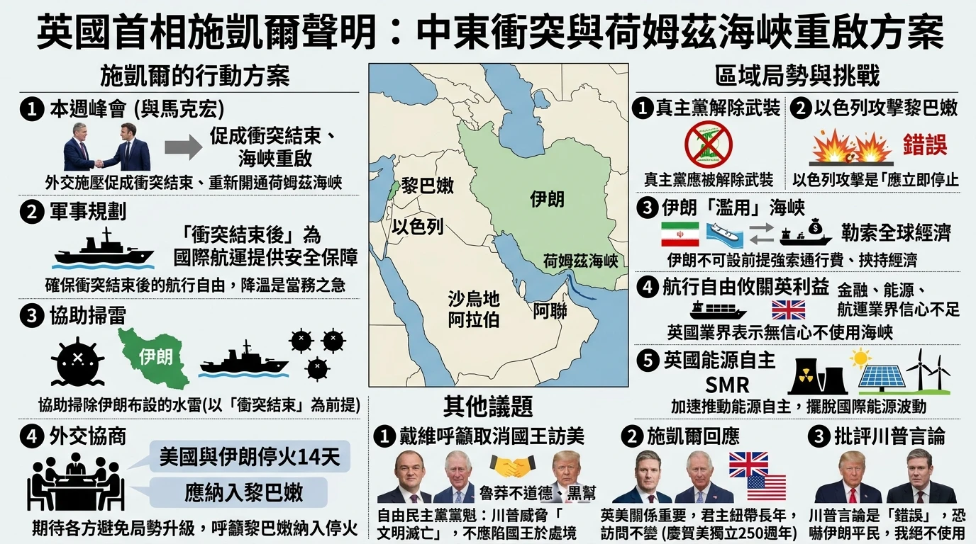 英國首相施凱爾今天表示,本週他將與法國總統馬克宏(Emmanuel Macron)召開領袖峰會,與各國討論促成荷姆茲海峽重新開通、結束中東地區衝突的行動方案。