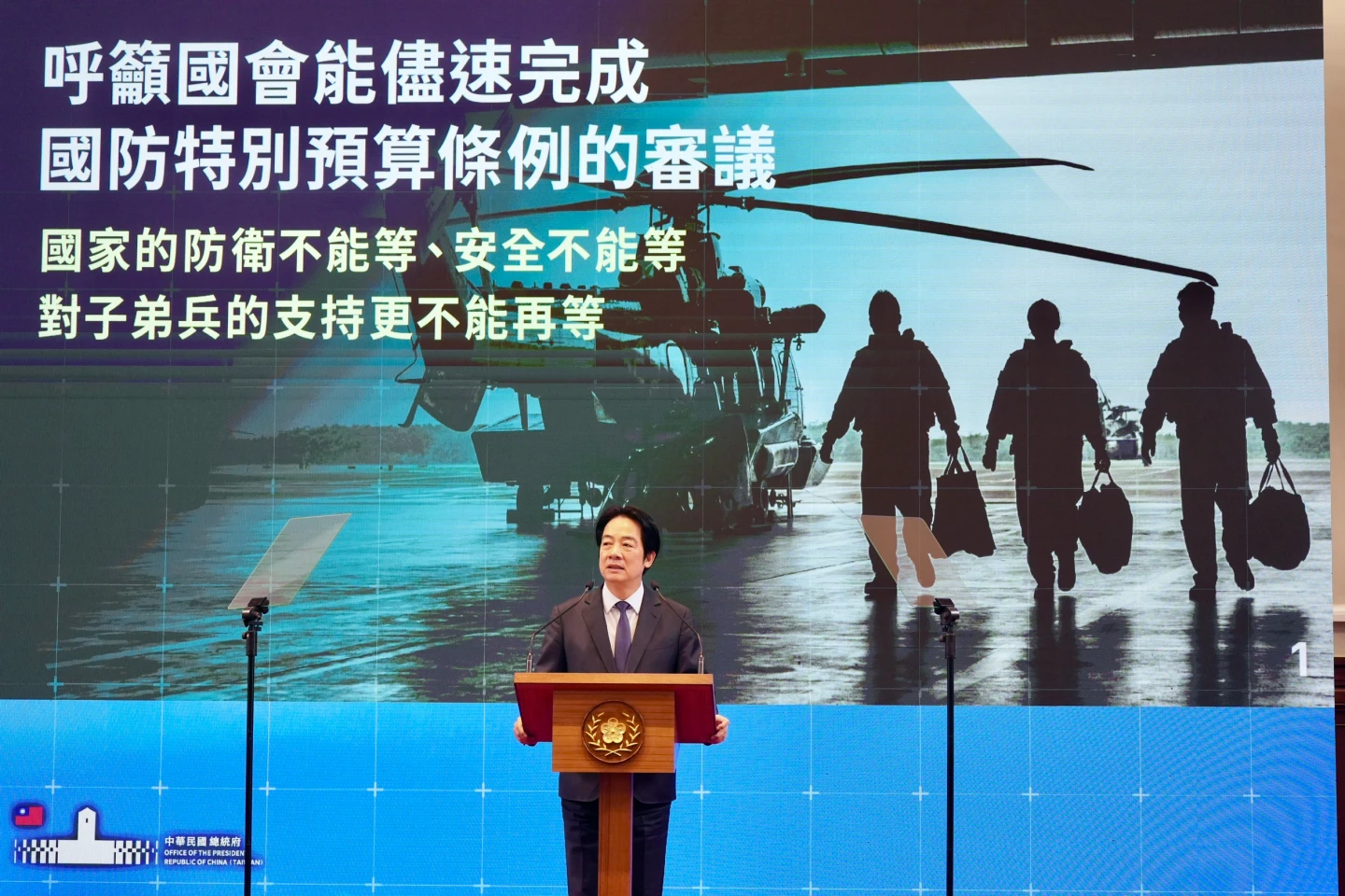 賴清德說,立法院第十一屆第四會期1月底已結束,行政院所提「國防特別預算條例」草案,歷經兩個月的努力,卻持續遭受阻擋,未能付委審查。他期待,立法院新會期開議後,能儘速完成此案的審議,「國家的防衛不能等、安全不能等,對子弟兵的支持更不能再等。」