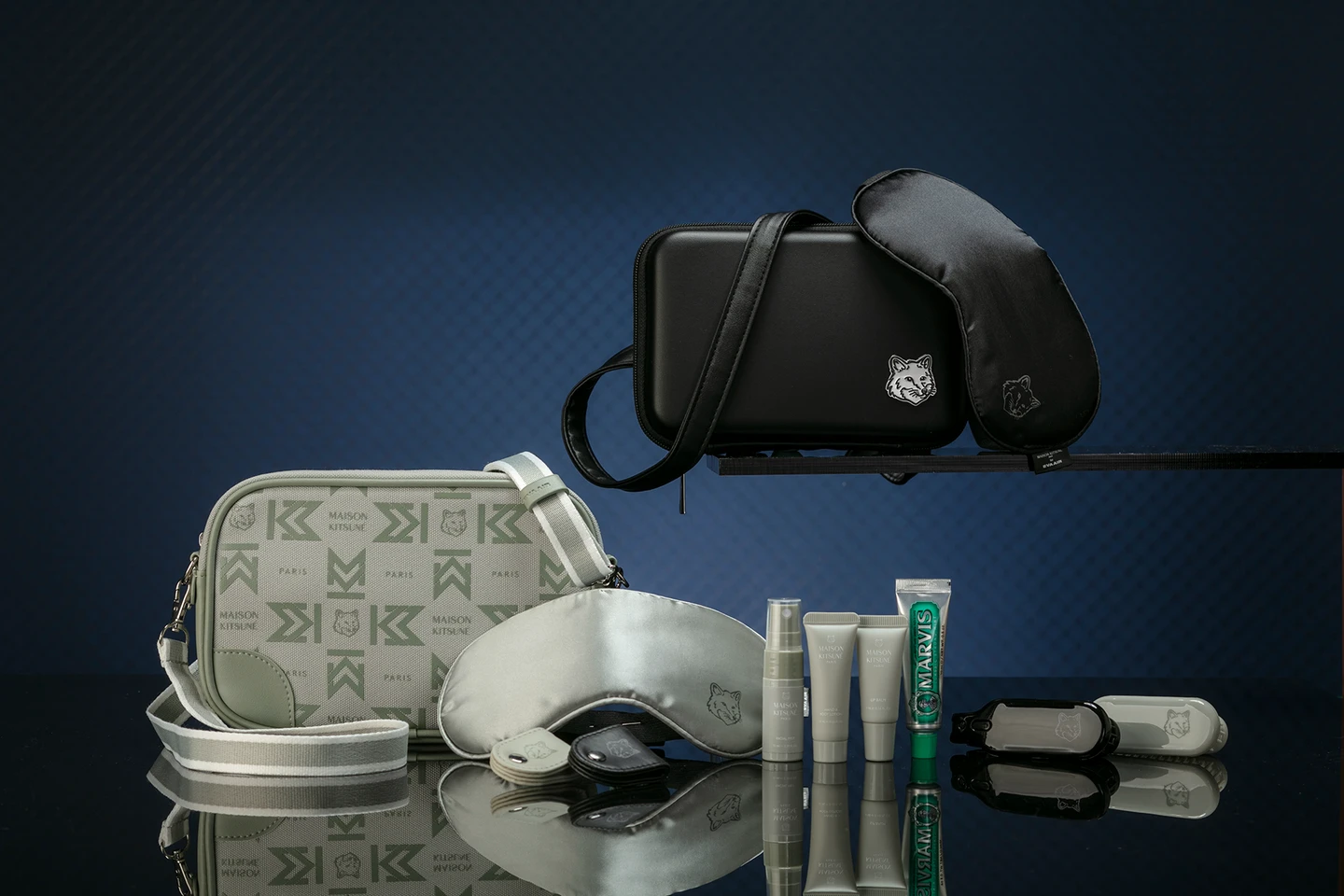 長榮航空指出,機上服務用品不斷推陳出新,現行與時尚潮牌Maison Kitsuné合作,首次將皇璽桂冠艙過夜包與睡衣使用同一個品牌設計。Maison Kitsuné的品牌經典元素為狐狸圖騰,睡衣以其為設計亮點,上衣繡有精緻品牌狐狸頭Logo,褲身則印有標誌性Monogram圖騰,全套睡衣選用50%環保材質rPET布料製成,彰顯品牌獨特風格與細膩質感。