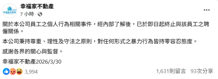幸福家不動產強調,公司秉持尊重、理性及守法之原則,對任何形式之暴力行為皆持零容忍態度。感謝各界的關心與監督。