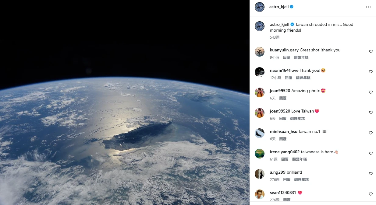 林琪兒曾在任務期間從外太空拍攝台灣的壯麗景象。取自IG@astro_kjell zoomin