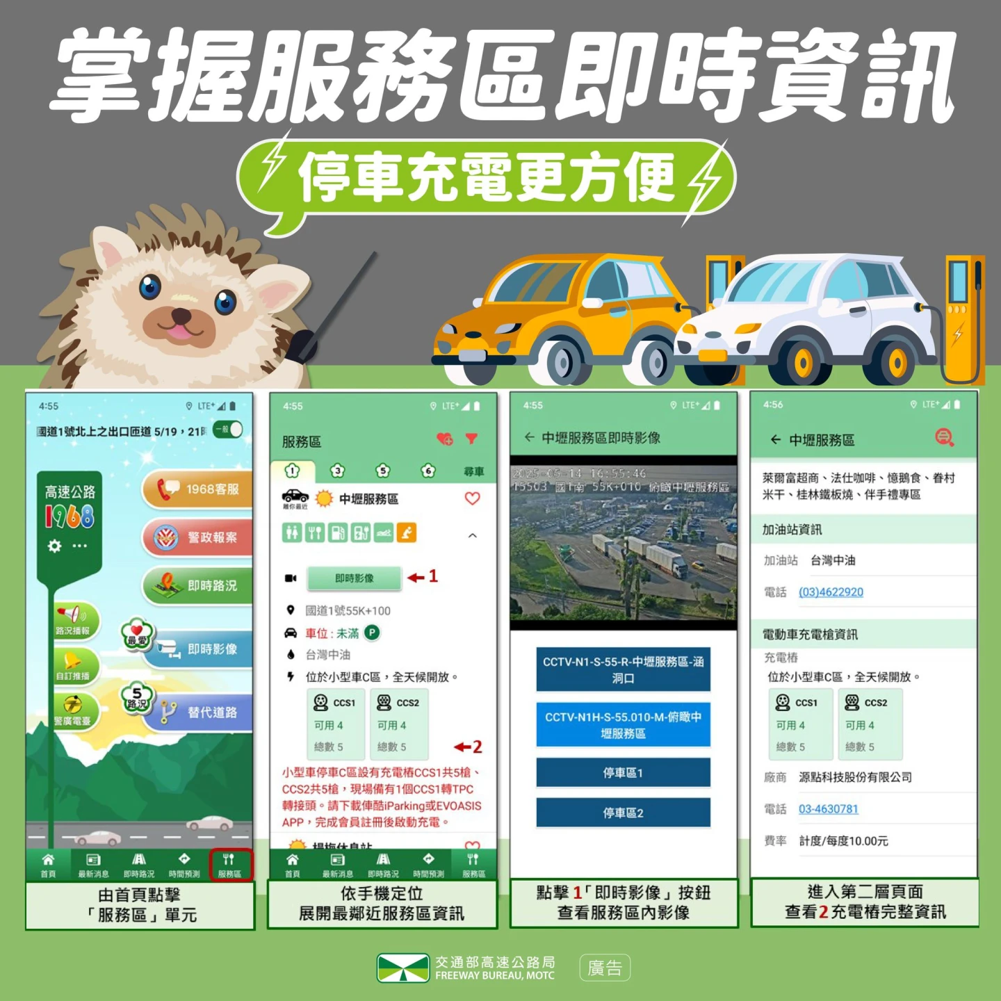 「高速公路1968」App一站式查詢充電樁規格、可用數量