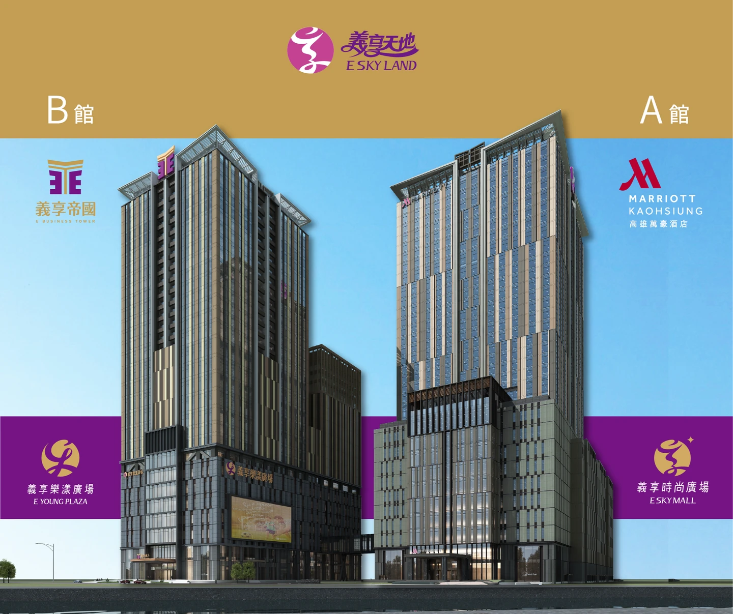 義享天地A館以百貨購物與飯店機能為主,全新B館預計於2026年底開幕,聚焦大型娛樂,商場定位較A館客群年輕,涵蓋電影院、互動型遊樂設施、運動休閒體驗、時尚潮流名店、文創商業廣場,以及複合式美食消費空間,未來2館會彼此串聯,將打造北高雄最大娛樂中心。