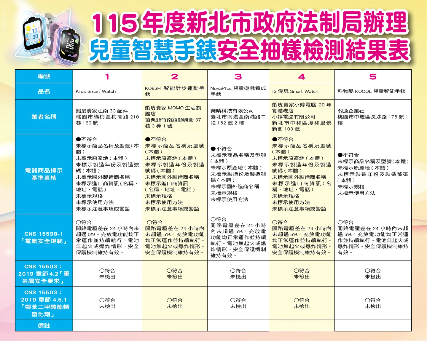 【記者曾伯愷/新北報導】新北市2023年發生有學童配戴智慧手錶發生自燃意外,新北市政府法制局消保官日前隨機抽驗市售5款智慧手錶,發現商品在「電氣安全」及「化學物質」檢測全數符合標準,但在「商品標示」部分全數不合格,已要求業者改善並在通路下架。限期內若未改正,得依《商品標示法》處2萬元以上20萬元以下罰鍰。