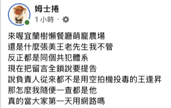 臉書擁有63萬追蹤者的網紅「姆士捲」在粉專發文直指,投毒者身分,宜蘭當地其實早就很多人都知道,並非秘密。他指出,新聞中的王姓嫌犯,正是他先前檢舉過的「樹懶餐廳」(萌寵農場)實際負責人王逢昇,被抓包後已經改由其他人掛名。姆士捲表示,王嫌因核心員工跳槽而懷恨在心,利用空拍機假藉偵查名義,實則投毒報復,甚至受害農場可能不只一家,只是其他業者不想惹麻煩。