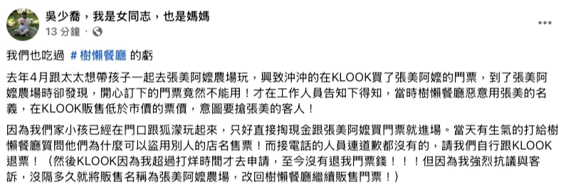 除了投毒惡行,3.4萬人追蹤的臉書粉專「吳少喬,我是女同志,也是媽媽」也在此事爆發後揭露樹懶餐廳的黑歷史。吳少喬表示,去年4月帶孩子前往宜蘭旅遊時,在KLOOK購買標榜「張美阿嬤農場」的門票,到現場才發現無法使用,原來是「樹懶餐廳」惡意使用張美阿嬤的名義在平台上販售低價票,意圖混淆視聽、搶奪客源。